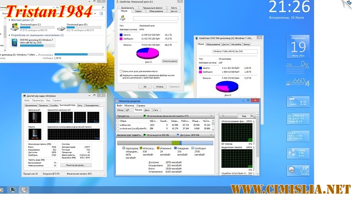 32-х и 64-х битные ОС Windows® 7™ с интегрированными обновлениями, оформлением в светло-голубом стиле и ручной установкой на 2 DVD. Содержит в себе набор программ, тем оформления, картинок рабочего стола, гаджетов и пр., т.е. почти всё для начала работы с системой после установки, а так же предоставляет возможность проверить компьютер перед установкой. Дополнительно в 64-х битный образ системы добавлена профессиональная редакция для установки на GPT диски. Сборка предназначена для тех, кто желает получить почти готовую систему для работы после установки.ru_windows_7_ultimate_with_sp1_x86_dvd_u_677463.iso